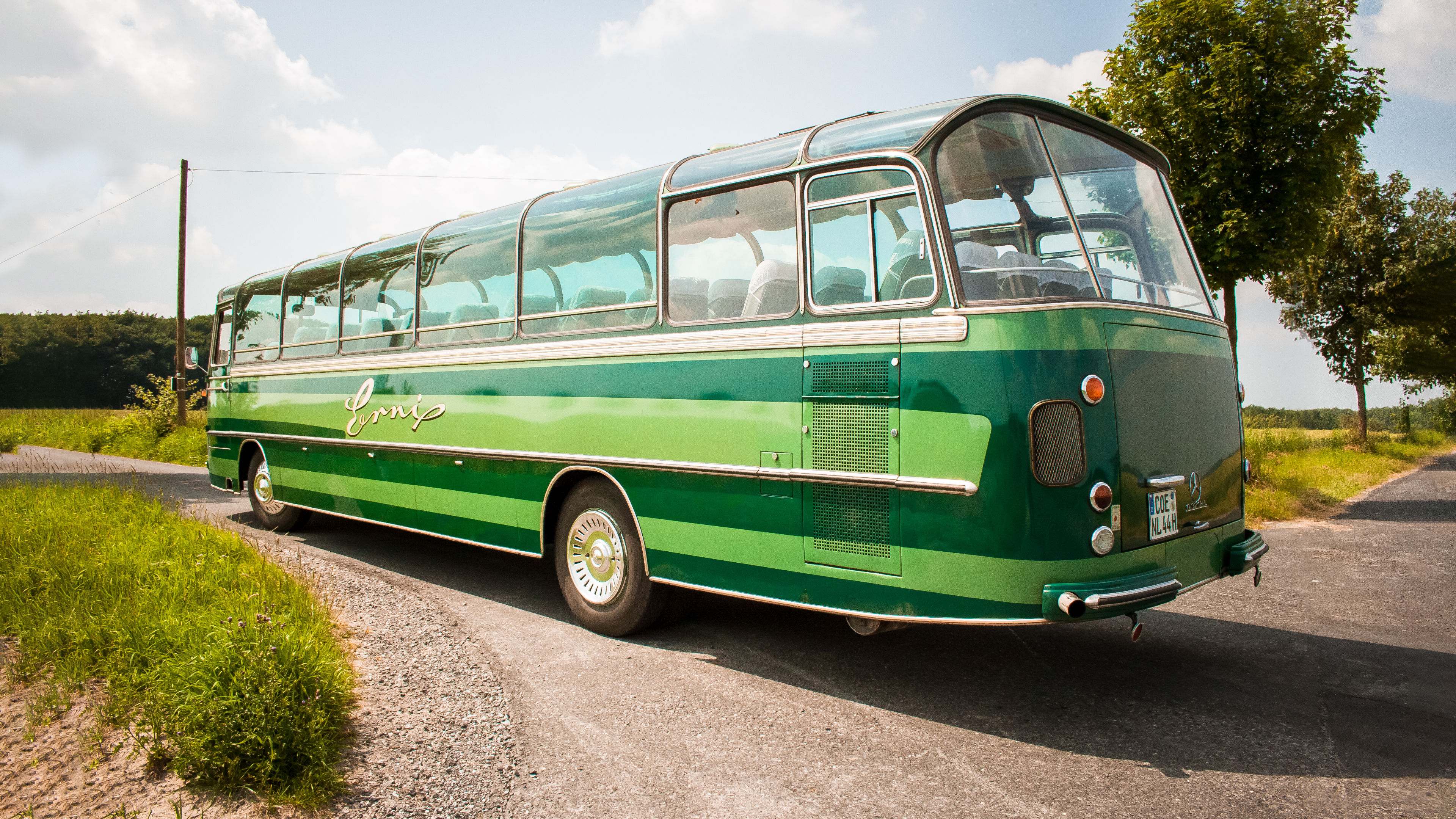 Das Fahrzeug ist von dem Düsseldorfer Reisebusunternehmen "Erni Reisen" eingesetzt worden - auch bei den ersten Fahrten nach Italien. Der Schriftzug "Erni" war daher erst nur der Firmenhinweis, bis er zum Namen des Busses wurde. Aufgrund der auffälligen Lackierung nennen wir ihn heute "Grüner Erni".